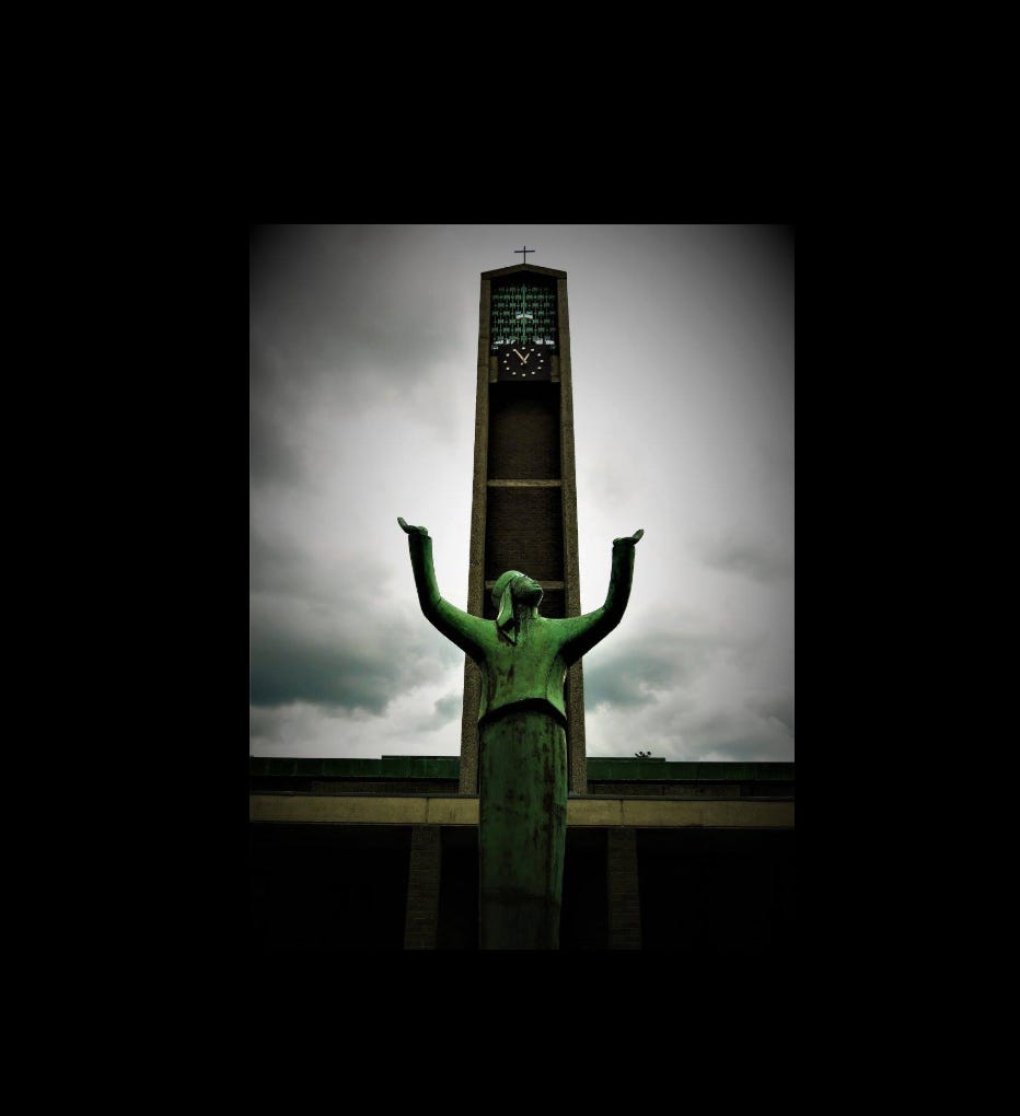 I was wondering why I was attracted to Stuart’s sculpture and found I had been looking at her work all my little life for she had done the teak stations of the cross in my hometown church of St. Brigid’s in the Curragh Camp. From being a child stained with the music of coloured glass and my soul being wafted away incense to a Heaven I then believed until to the now of this in cold Dublin rain going back to the scene of the same wooden statues in my own hometown church.