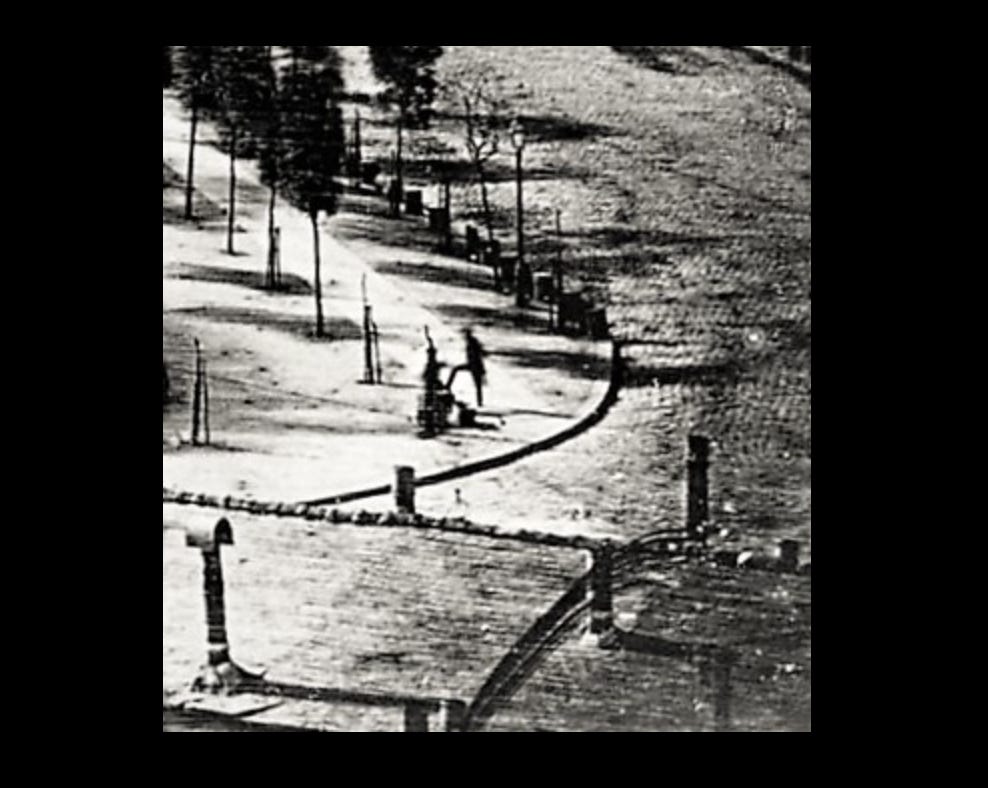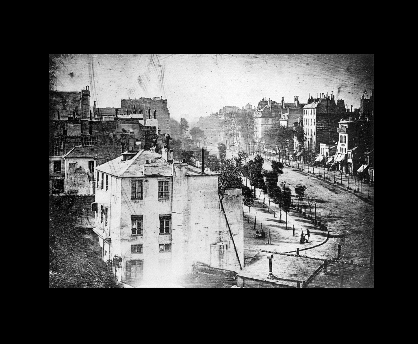 View of the Boulevard du Temple, taken by Daguerre in 1838 in Paris, includes the earliest known photograph of a person. The image shows a busy street, but because the exposure had to continue for four to five minutes the moving traffic is not visible.